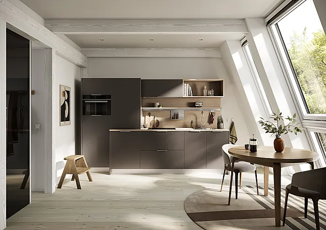 Wundervolle VEGAS Braun metallic Front kombiniert mit einer hellen Holz Optik Arbeitsplatte.